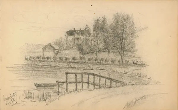 landskap, villa, sjø, bro, robåt, gelender, trær,