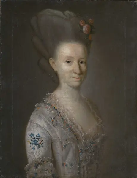 Beskrivelse: Halvfigur 3/4 profil th. Høy frisyre strøket vekk fra ansiktet rosa blomster i håret. Utringet kjole hvit/blå i smale striper m. blomster i rødt og blått rysj langs utring- ningen. Mørk bakgrunn.