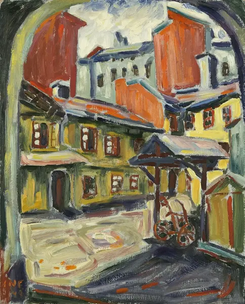 Beskrivelse: Bakgård sett gjennom portrom. I forgrunnen th. sykkelskur m. drakjerre. I mellomgrunnen to-etasjes bygning. I bakgrunnen leiegårder og branngavler.