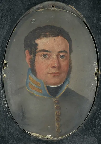 Portrett, en face. Brunt hår, krøller i tinningene. Kinnskjegg. Brune øyne. Gylden hudfarge. Grå uniform med gullknapper. Høy stiv, blå krage med gullstriper. Grå bakgrunn.