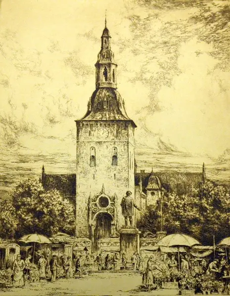 arkitektur, kirke, torv, torvhandel,, kirkespir, boder, parasoller, trær