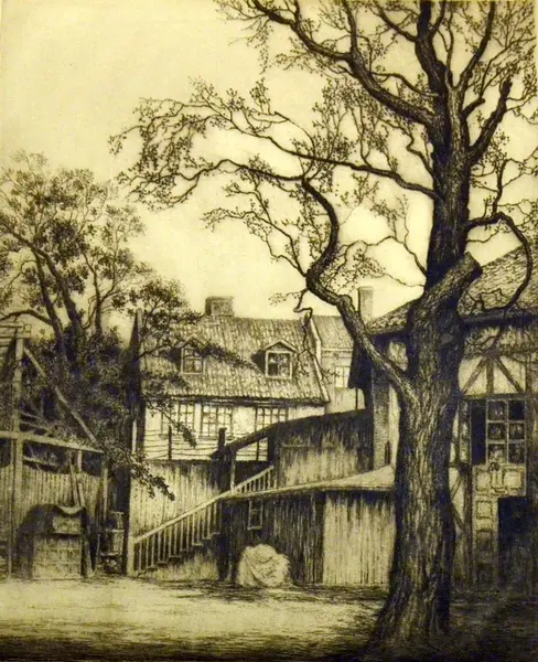 arkitektur, bindingsverkhus, trehus, uthus, gårdsplass, trær,
