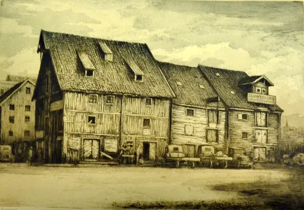 arkitektur, sjøbuer, bygninger, lastebiler, plass, takluker, arbeidere