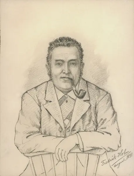 Portrett av mann med pipe sittende, dress, enface