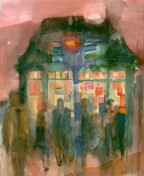 Kiosk med mennesker / kunder, Narvesenkiosk (?)