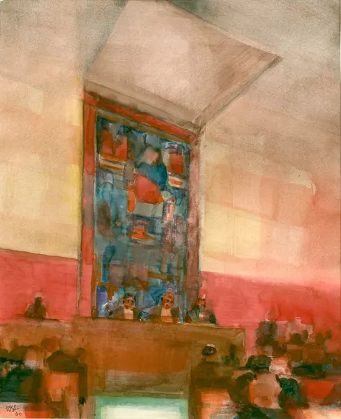 Bystyresalen med mennesker, veggteppe, politikere, podium, talerstol, tilhørere