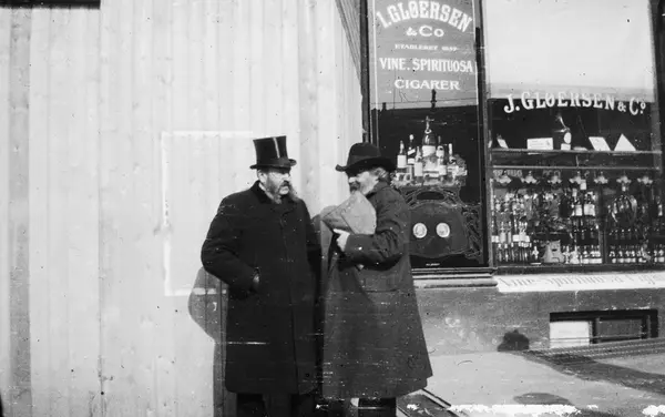 gate, menn, gateliv, forretningsgård, J. Gløersens vinforretning, Grand Hotel, plankegjerde