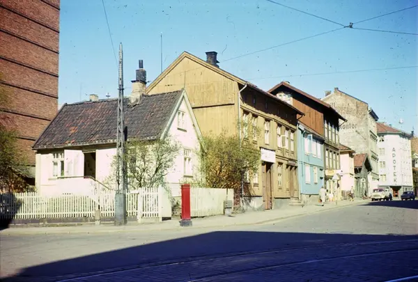 trehusbebyggelse, hage, stakitt, Briskeby kull- og vedforretning (Albin Upp), bygård, gavlvegg, mennesker, biler