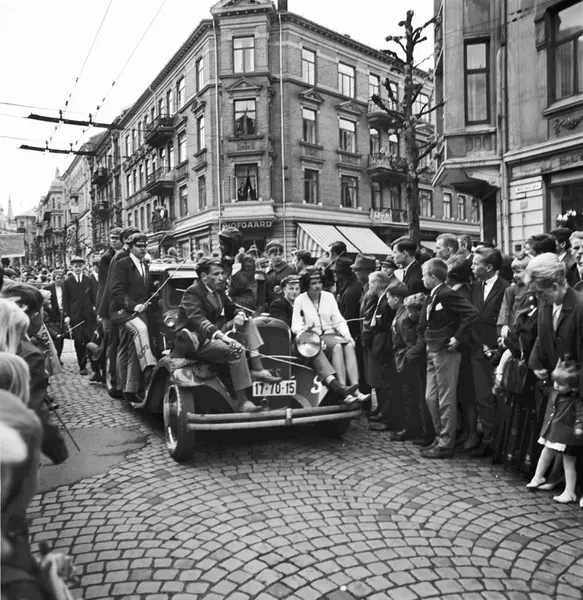 17. mai-feiring, russetog, russebil, publikum, bygård