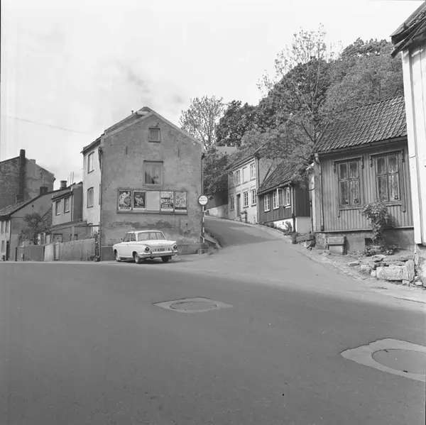 gatehjørne, trehusbebyggelse, bygård, gavlvegg, kinoreklame, gatelegeme, kumlokk, bil