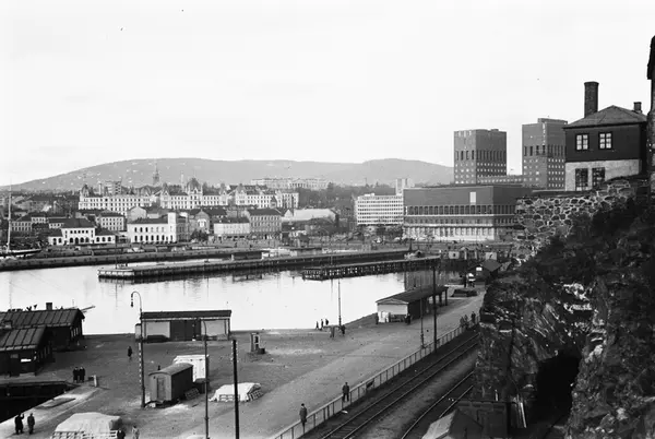 utsikt, Akershus festning, havn, vei, jernbane, Rådhuset, Vestbanestasjonen, Victoria terrasse