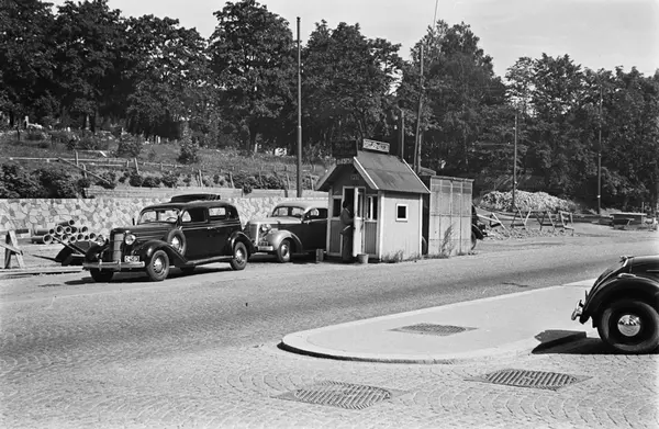 Fremst en Strømmen-Dodge 1935 7-seter med soltak (Dodge montert og modifisert på Strømmesn Værksted), så en 1938-modell trolig også Dodge. Til høyre nesen på en Peugeot 202 1938.