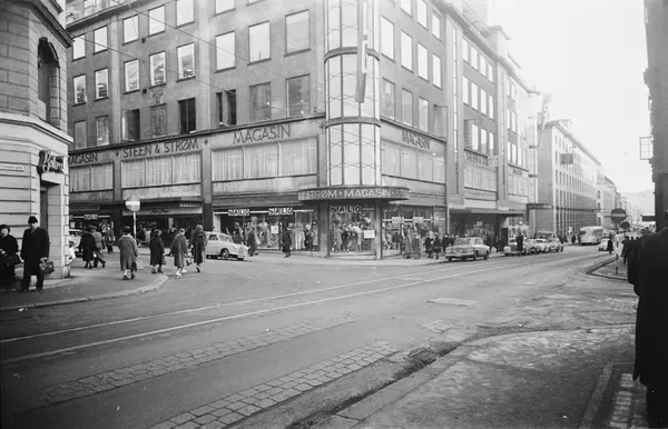 gatekryss, mennesker, biler, gateliv, forretningsgårder, Steen & Strøm stormagasin, trikkeskinner