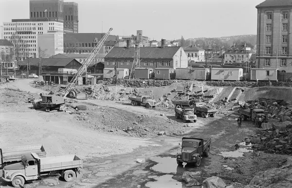 rivningstomt, byggetomt, lastebiler, kran, anleggsbrakker, bygårder, kontorbygniger, Rådhuset, Vestbanestasjonen