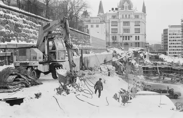 rivningstomt, byggetomt, byggevirksomhet, menn, anleggsarbeidere, gravemaskin, lastebil, mur, Ruseløkka skole, Victoria terrasse, kontorbygning, snø
