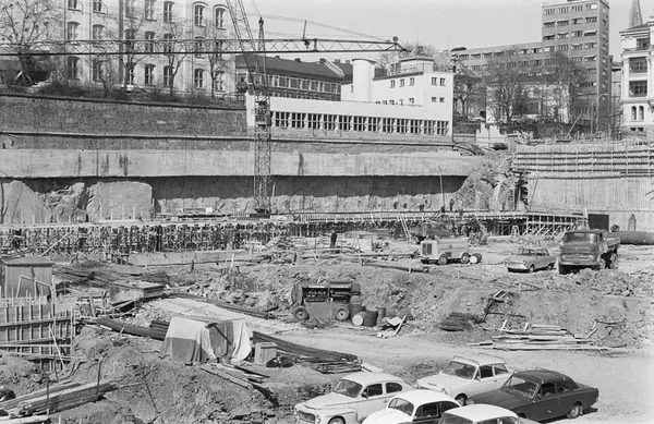 byggetomt, byggevirksomhet, menn, anleggsarbeidere, forskalinger, biler, kran, mur, Ruseløkka skole, Ingeniørenes Hus