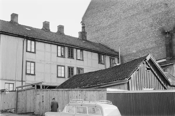 Nordre gate 3 nærmest, videre baksiden av Nordre gate 5 samt gavlveggen til Stolmakergata 6.