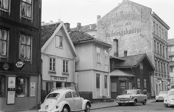 gateløp, trehusbebyggelse, forretninger, bygård, biler