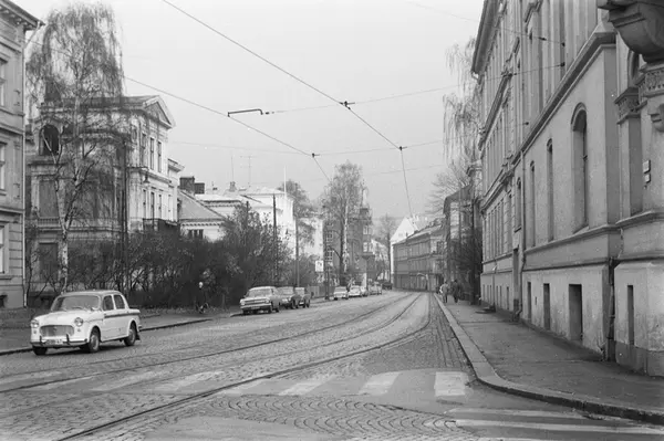 gateløp, bygårder, villaer, brostein, trikkeskinner, biler, mennesker