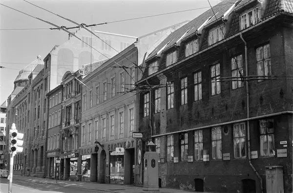 gateløp, bygårder, Stattholdergården (Calmeyergården), forretningsgårder, trafikklys, trolleybussledninger