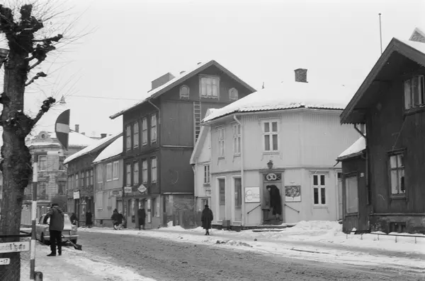 gateløp, trehusbebyggelse, mennesker, snømåking, bil, bygård