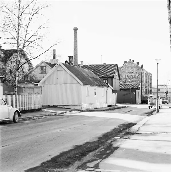gateløp, trehusbebyggelse, bygård, fabrikkpipe, biler