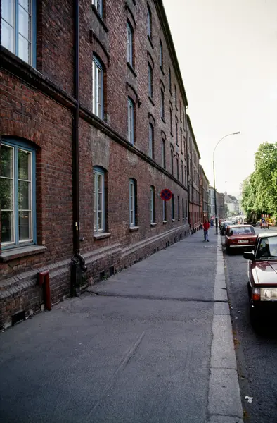 gateløp, fortau, parkerte biler, mennesker, bygårder, gråbeingårder