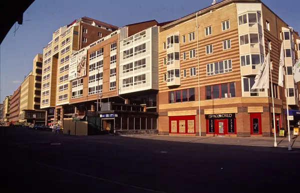 gateløp, boligblokker, forretninger, nedgang til Grønland T-banestasjon, mennesker, biler, reklameflagg, kontorbygninger