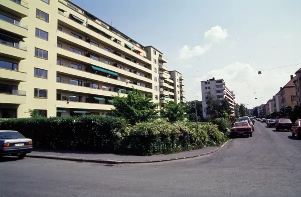 gatekryss, gateløp, biler, boligblokker, hage, bygårder