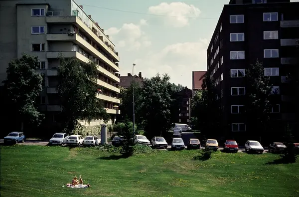 gressplen, mennesker, parkeringsplass, biler, boligblokker