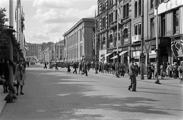 Karl Johans gate pyntet til kongens hjemkomst, 1945.