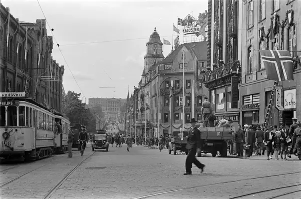 Karl Johans gate pyntet til kongens hjemkomst, 1945.