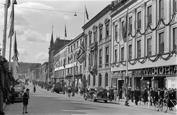 Karl Johans gate pyntet til kongens hjemkomst, 1945.