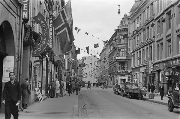 Skippergata pyntet til kongens hjemkomst, 1945.