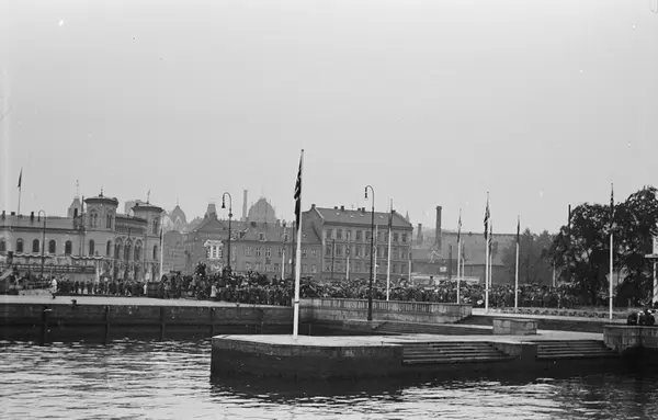 Rådhusbryggene, kongens hjemkomst, soldater, paviljong, publikum, Vestbanestasjonen, bygårder