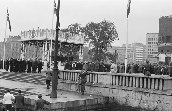 Rådhusbryggene ved kongens hjemkomst, 1945.