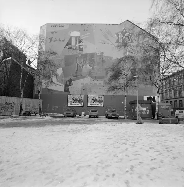 parkeringsplass, biler, byggetomt, bygård, gavlvegg, reklame for Frydenlunds bryggeri