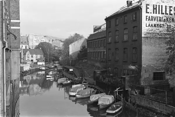 utsikt, elv, småbåthavn, fabrikkbygninger, bygårder, gavlreklame