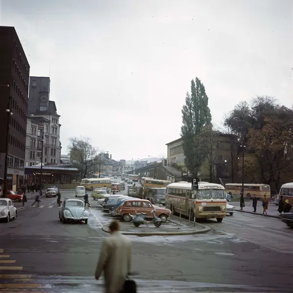 plass, kontorbygninger, paviljong, gateliv, biler, busser, mennesker, restaurant Skansen