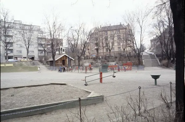 plass, park, lekeplass, barnepark, sandkasse, lekeapparater, drikkefontene, trapp, bygårder