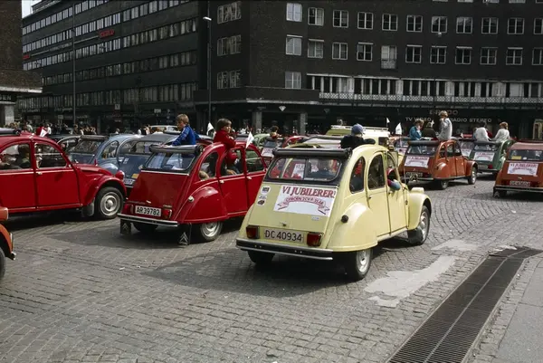 Fotografert 7. mai 1983 i forbindelse med et arrangement for å feire Citroën 2CVs 35-årsjubileum. Arrangementet var et samarbeid mellom importøren Norsk Citroën AS og Norsk 2CV Klubb.