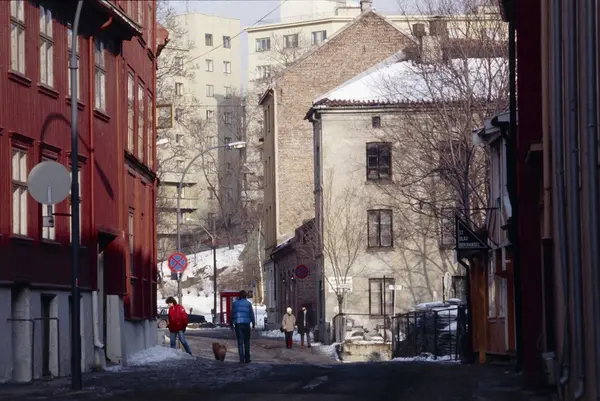 gateløp, bygårder, trehusbebyggelse, boligblokker, mennesker, snø
