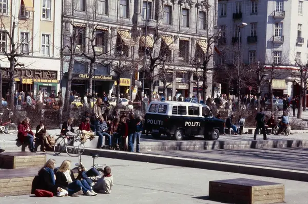 park, basseng, benker, mennesker, vårsol, politibil, Ford Transit, forretningsgårder, Victoria kino, Hotel Nobel, Grand Hotel