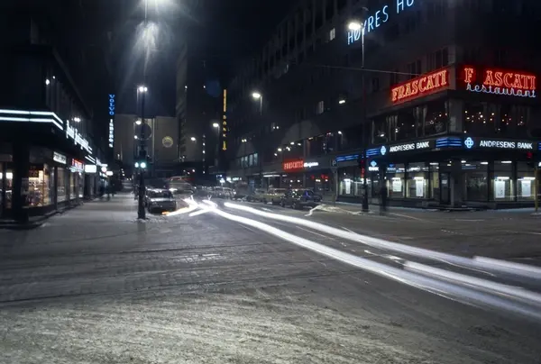 gateløp, forretningsgårder, Høyres Hus, Andresens bank, Rådhuset, biler, snø
