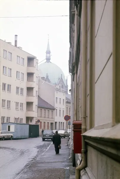 gateløp, bygårder, Margaretahjemmet, mann, biler, Trefoldighetskirkens kuppel