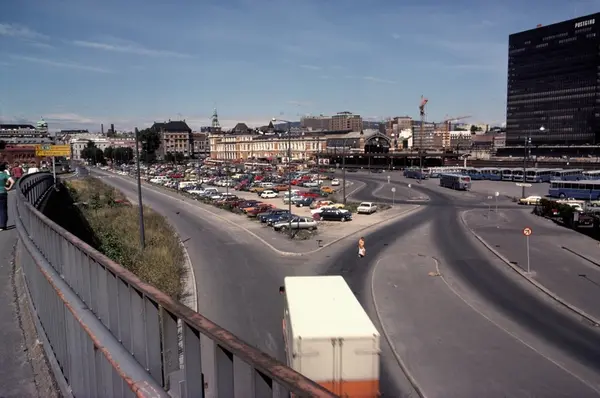 veier, parkeringsplass, biler, busser, Østbanestasjonen, kraner, Postgirobygget, kontorbygninger
