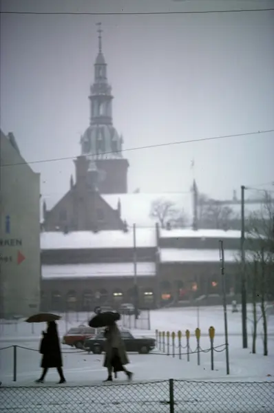 parkeringsplass, parkometere, kvinner, paraplyer, snøvær, forretningsgård, basarer, Oslo Domkirke