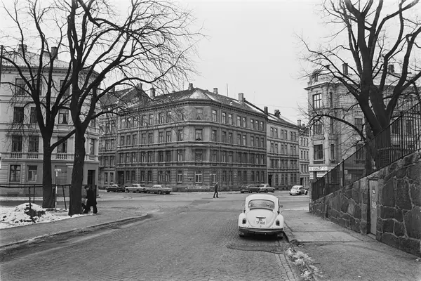 gatekryss, bygårder, biler, mur og gjerde mot Sofienberg kirke