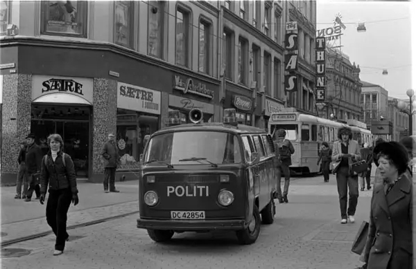 gateløp, gateliv, mennesker, politibil, trikk, forretningsgårder