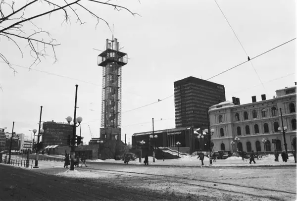 torg, gate, trikkeholdeplass, mennesker, trafikklys, gatebelysning, Trafikanten, tårn, Østbanestasjonen, Oslo Sentralstasjon, Postgirobygget, kontorbygning, snø
